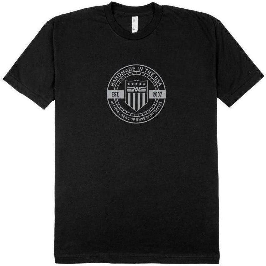 The ENVE Seal T-shirt is a quality short-sleeve tee created by American Apparel. This exclusive design features the ENVE 'Handmade in the USA' seal on the front and a large print of the distinctive ENVE logo on the back.