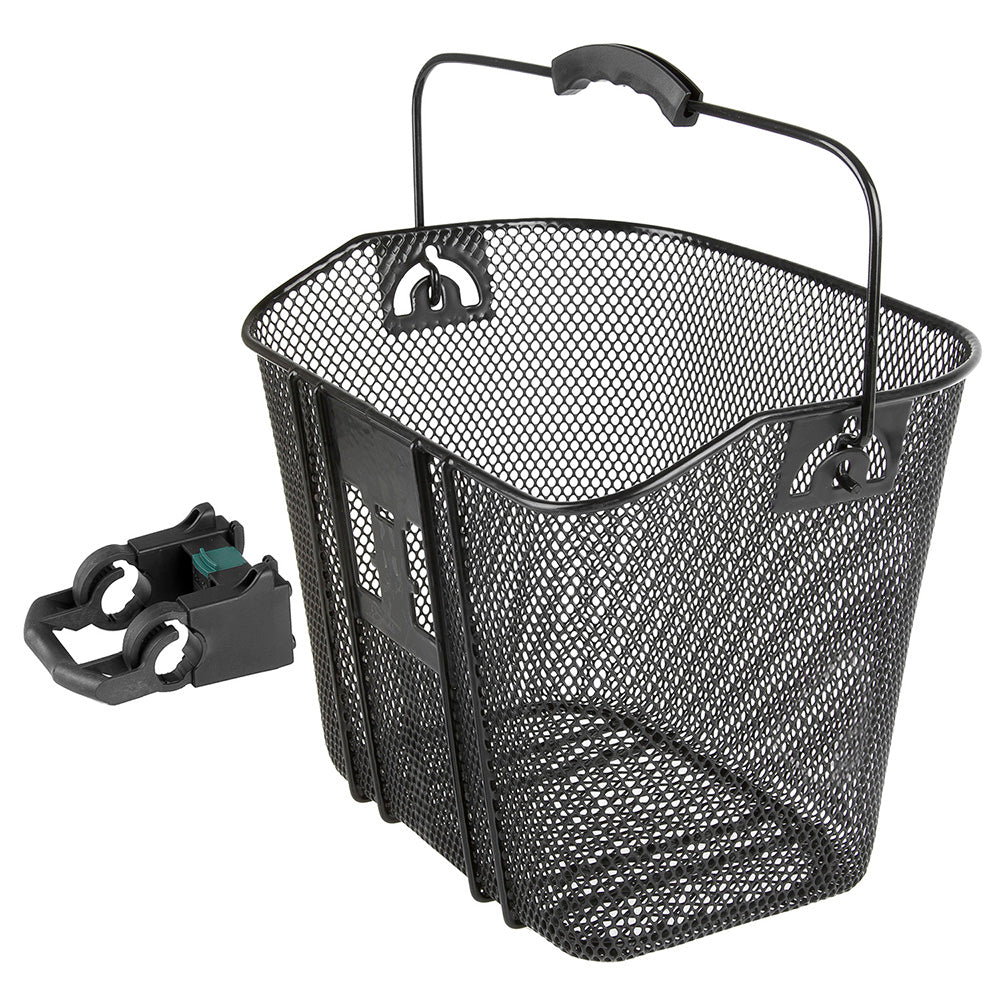 Wire mesh basket with easy-to-use handlebar-mounted plastic Quick Release bracket.Coated with durable plastic for superior corrosion resistance, this fine-mesh design prevents small items from slipping through gaps, unlike traditional wire baskets with larger openingsThe lightweight handlebar mounting bracket system suits most urban/trekking style bicycles and also enables this basket to be used in conjunction with suspension forks, as no additional basket support is required.The MTS-type plastic bracket includes plastic spacers to fit 22.2 -31.8mm handlebar diameters.This bracket cantilevers against the underside of the handlebar stem to prevent the basket weight causing the bracket to twist down on the handlebar.