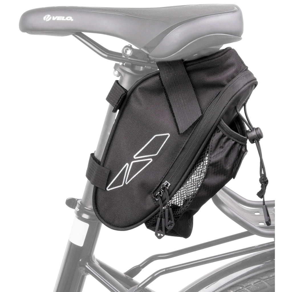 Die M-WAVE Amsterdam Bottle Satteltasche aus wasserabweisendem Polyester mit Ripstop-Gewebe bietet ein Hauptfach, einen Trinkflaschenhalter und lässt sich sicher mit Klettverschlüssen an verschiedenen Stellen des Fahrrads befestigen.