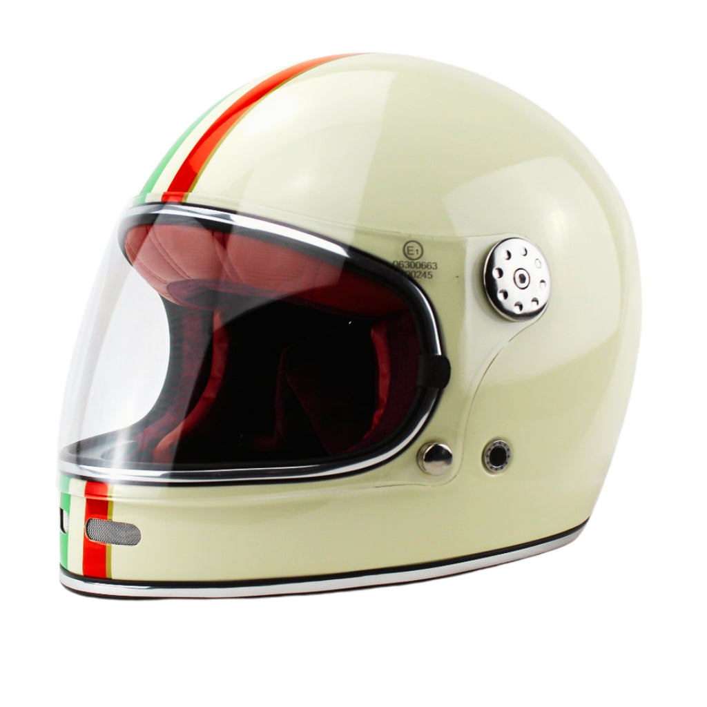Full Face Vintage Fibreglass Helmet br> Classic Racing Look & Design br> Replaceable Anti-Scratch Visor br> High-Comfort Suede/Leather Interior br> Double-D Retention Strap br> ECE-22.06 br> Weight: 1350+/-50g br> Available in Colours: Black/Copper, Black/White, Matt Black, 59 New Black Chequer, Rust Stripe, Stripes Cream/Burgundy, Cream, Italy Flag br> Available in Sizes: XS-XL