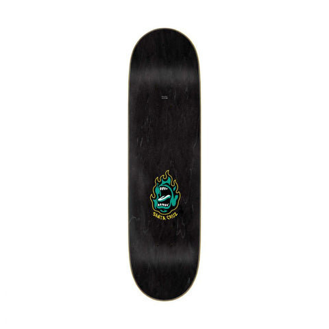 The Santa Cruz Skateboards Screaming Flame Birch 7 Ply deck features Santa Cruz Screaming Flame artwork on a stained teal bottom ply with small Screaming Flame graphic on stained black top ply.